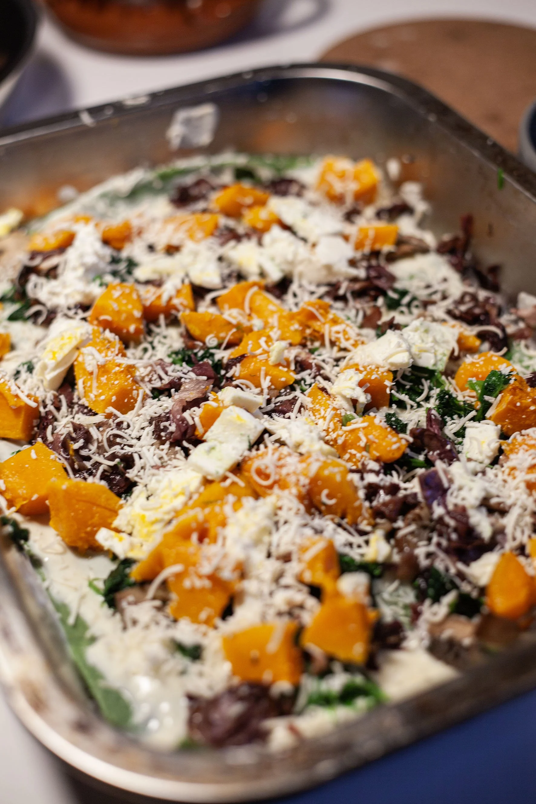Når høsten og vinteren folder seg ut med dype farger og fyldige smaker, er det som om kjøkkenet ber om noe varmt og samlende. Ovnsbakt gresskar, lett bitter radicchio og gyllenstekt sopp smelter sammen i lag på lag med silkemyk saus og ost. Dette er en lasagne som varmer i kalde tiden – rik, raus og full av smak.